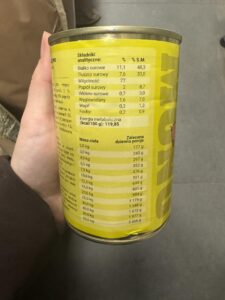 Karma niemal nie zawiera węglowodanów, co wskazuje na bardzo niski udział składników roślinnych. Wartość energetyczna wynosi 114 kcal/100 g – to średnia kaloryczność, odpowiednia dla psów o umiarkowanej aktywności.